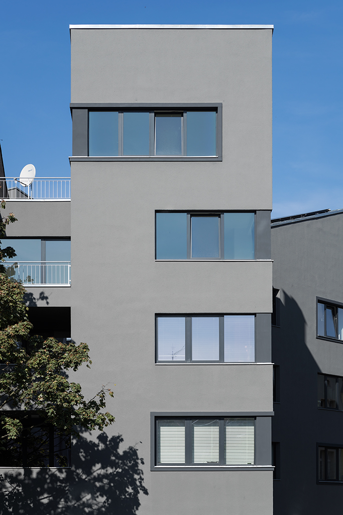 architektur // nahe dem botanischen garten entstand neben dem bau von fünf wohneinheiten das neue büro von kuhnbauen. angepasst an die umgebende bebauung entwarf snarq architekten einen expressionistischen volumenkörper, welcher die komplizierte form des grundstückes optimal ausnutzt. ein konkav geformtes dach ermöglicht genügend sonneneinfall für beide wohnungen im dachgeschoss – die fassade entwickelt sich aus der linienführung der angrenzenden straßen. die mittige anordnung des treppenhauses erlaubt wohnungen zu beiden seiten. schmale fenster, in bändern zusammengefasst, sorgen für einen maximalen lichteinfall.