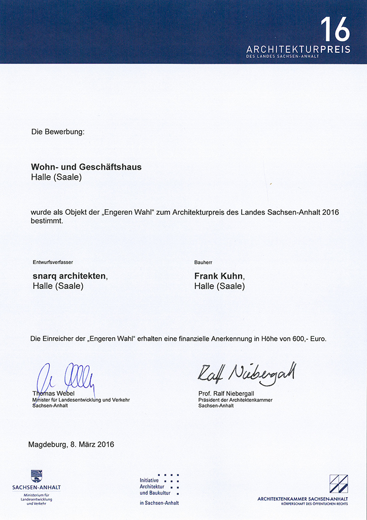 bei dem architekturpreis 2016 des landes sachsen-anhalt wurde der neubau als objekt der „engeren wahl“ bestimmt.