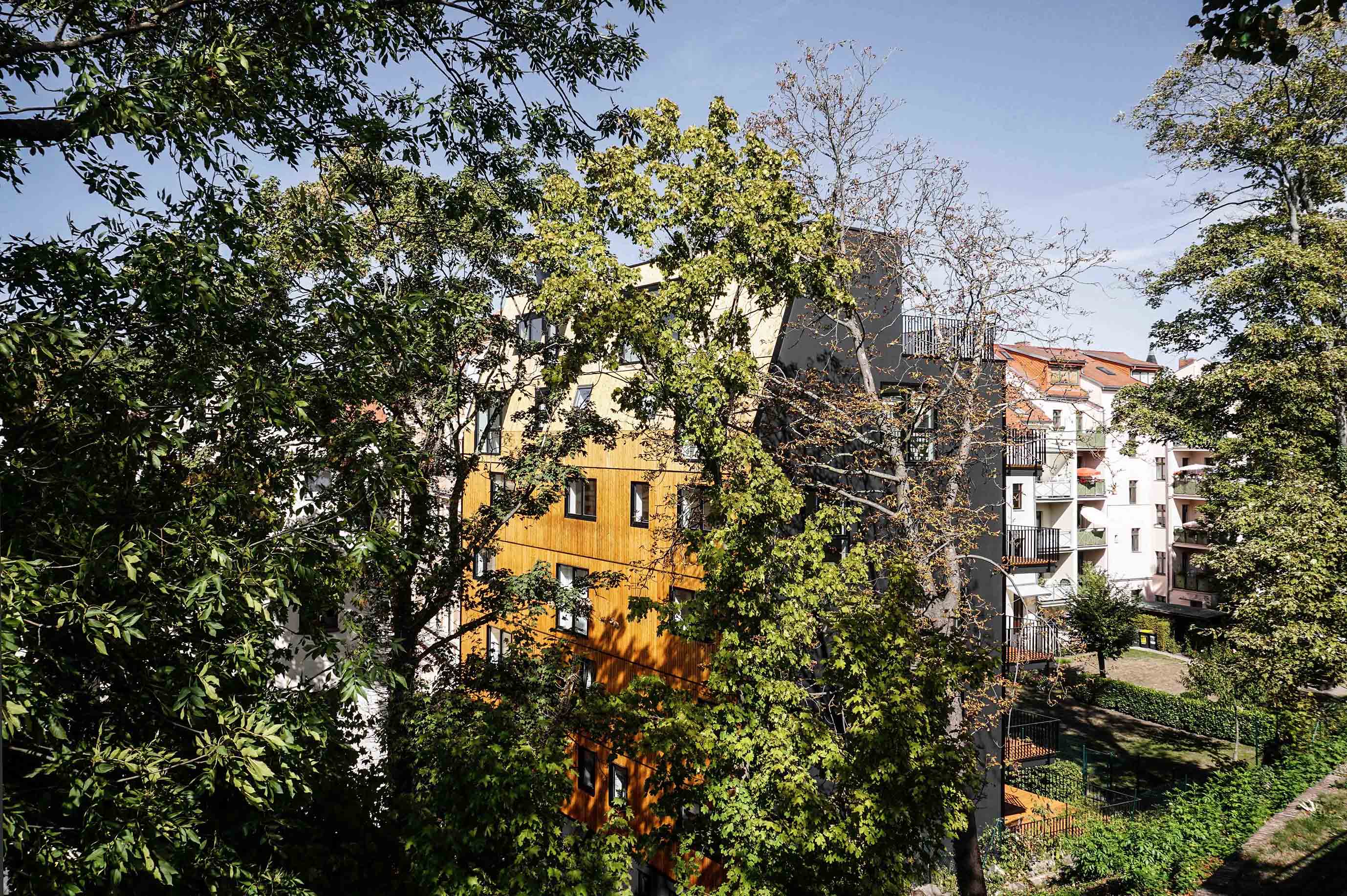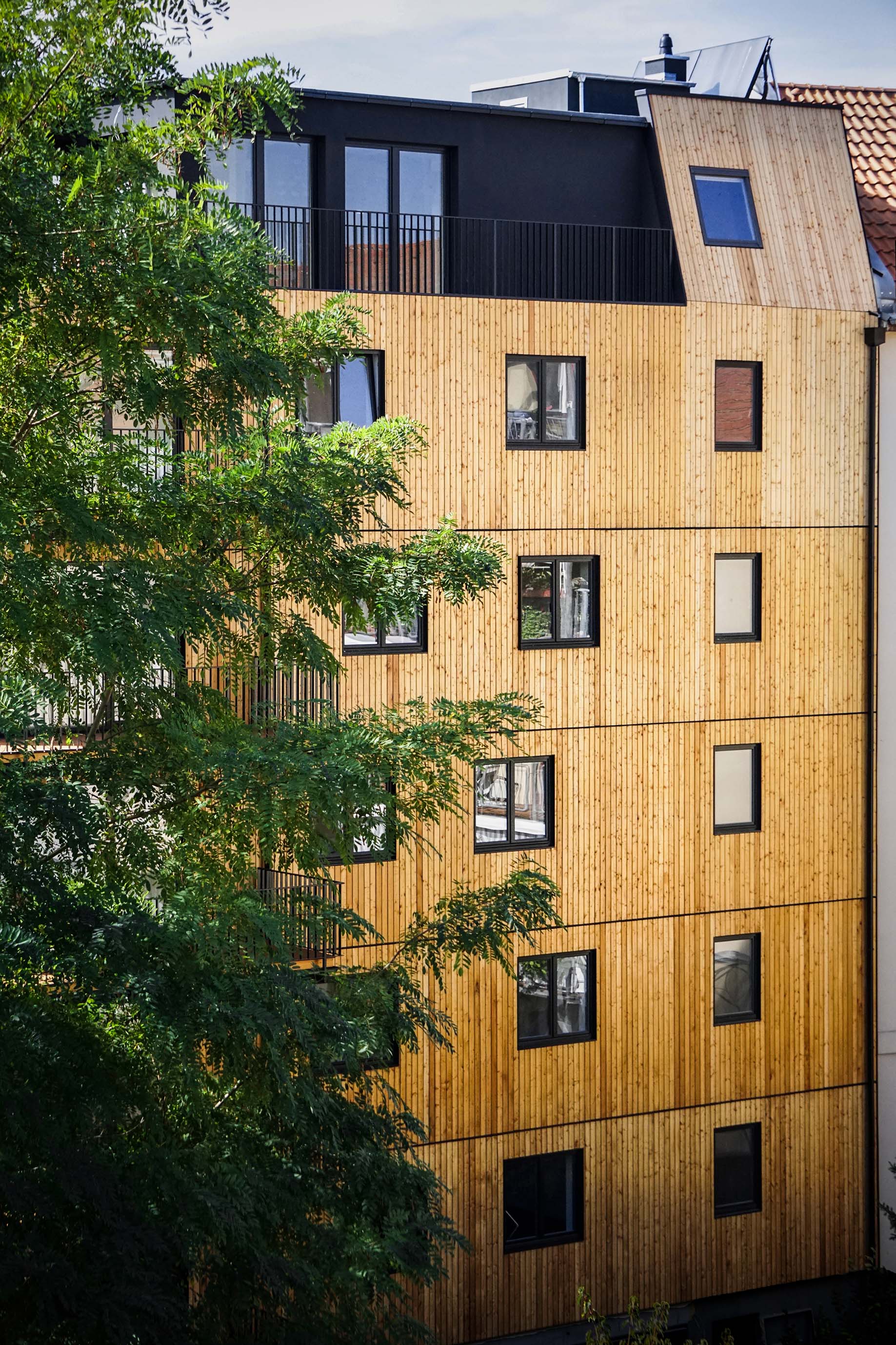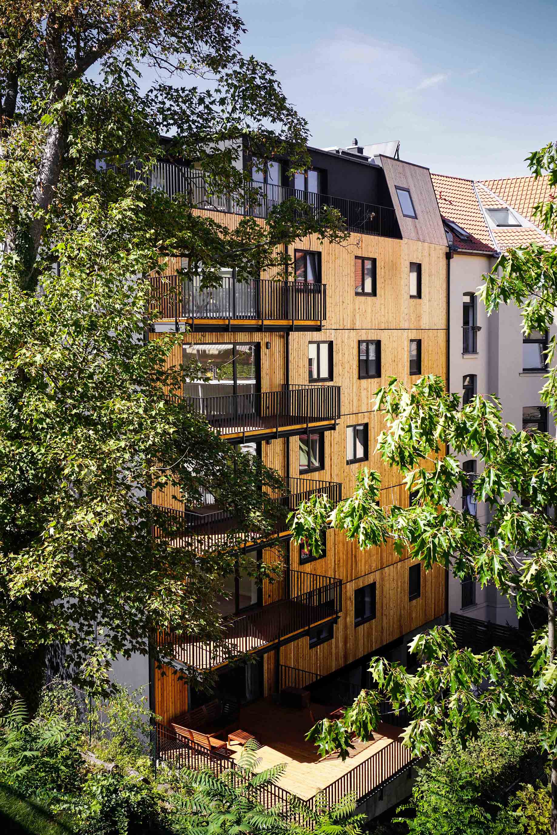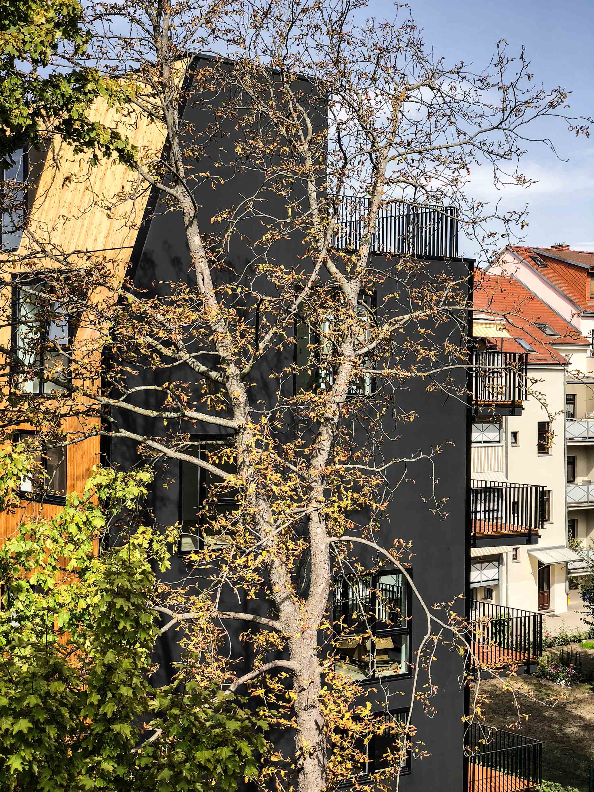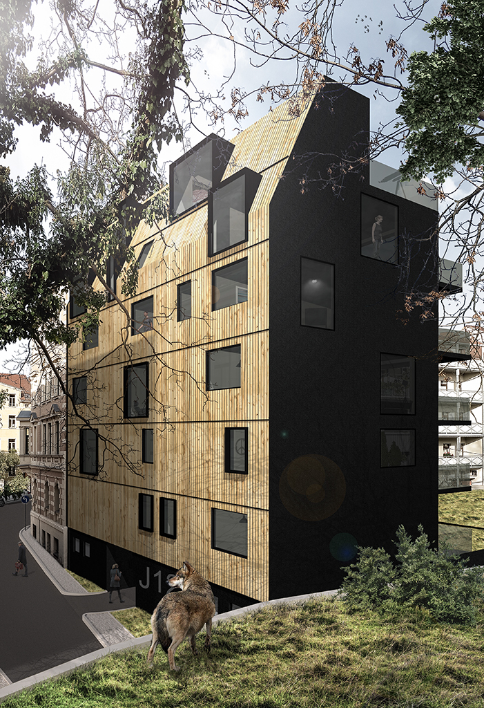 architektur // zwischen moritzburg, saale und dem botanischen garten befindet sich dieser mehrfamilien-neubau. in einer kleinen stichstrasse, im grünen gelegen, ist auf dem bislang als garagenstellplatz genutzten grundstück ein sieben-geschossiger baukörper entstanden, der über eine parkebene und sechs wohngeschosse verfügt. ziel des entwurfes war die prägung eines identitätsvollen, sich in die natürliche umgebung einfügenden wohnortes, welcher sich durch sein reduziert-markantes äusseres von der faden nachbarbebauung abhebt und in die exponierte lage gegenüber der moritzburg eingliedert. die sechs wohneinheiten zwischen 70 und 110 quadratmeter sind etagenweise konzipiert und richtung süden ausgerichtet. die fassadenbekleidung besteht aus vertikalen holzlamellen auf einem untergeordneten schlichten sockel. überdeckte fenster und balkonbereiche stärken den architekturentwurf und ermöglichen ein hohes mass an offenheit und transparenz. fenster in verschiedenen grössen, mit zum teil aus der fassadenebene herausragenden umrahmungen, bilden das pendant zur ruhigen und gleichmässigen holzverkleidung. ingesamt entsteht so ein spannendes fassadenbild mit einer natürlichen hülle und einem einzigartigen burgblick.