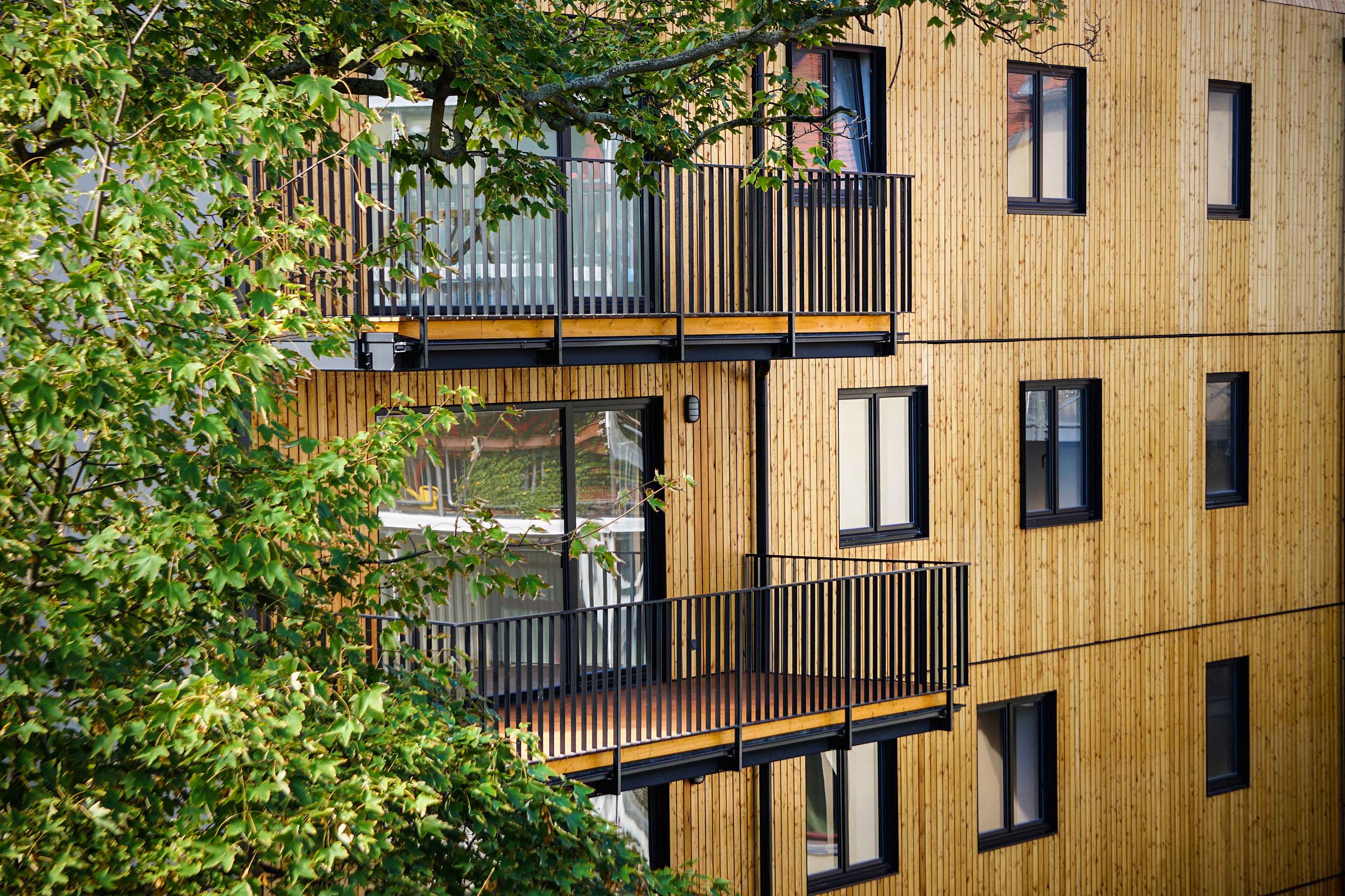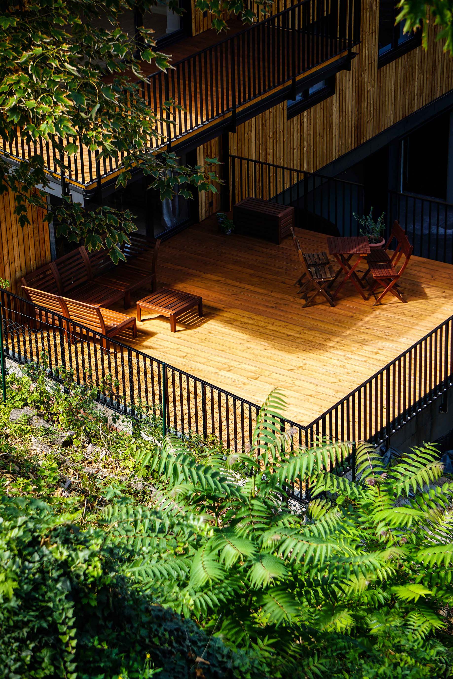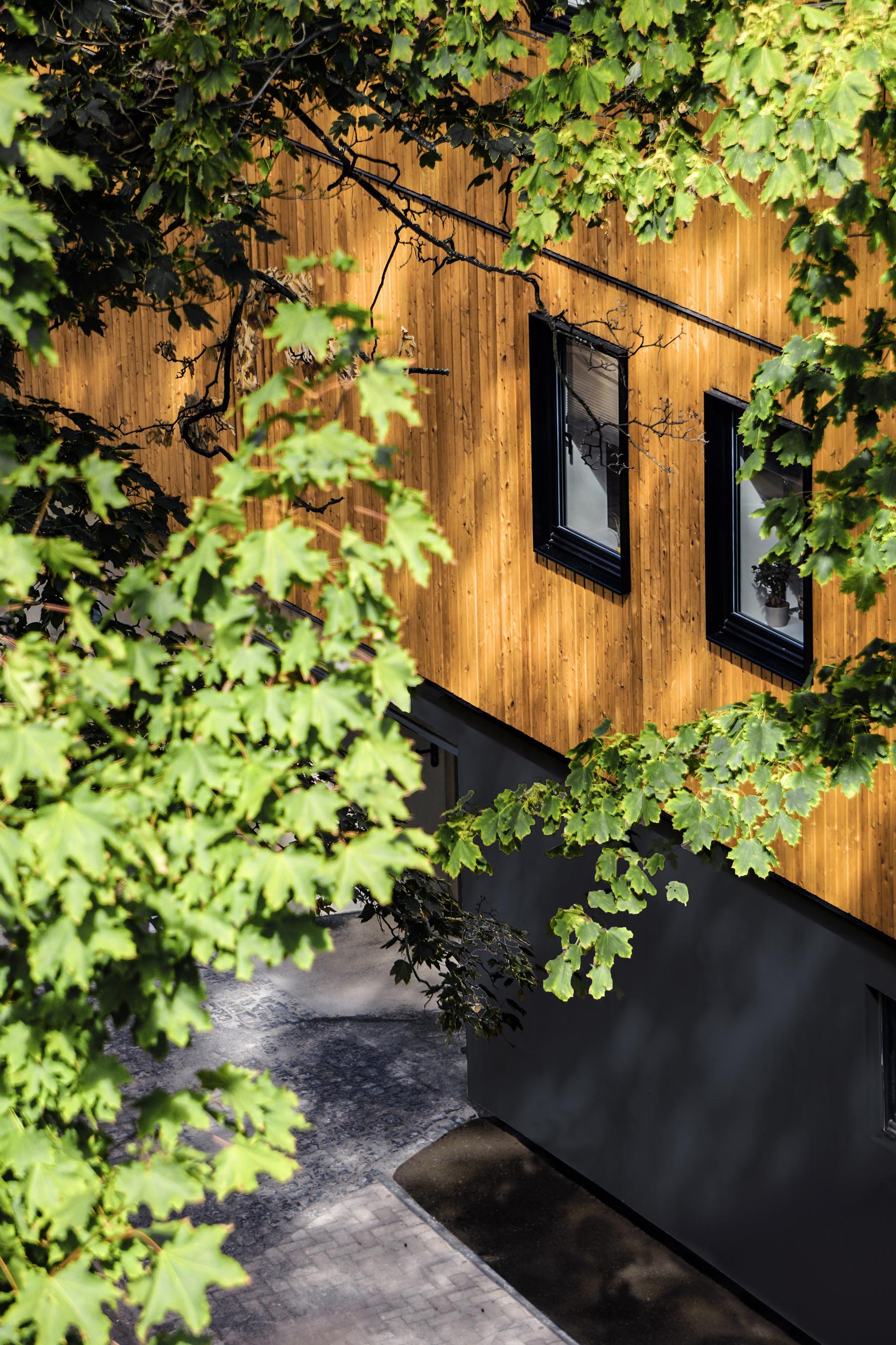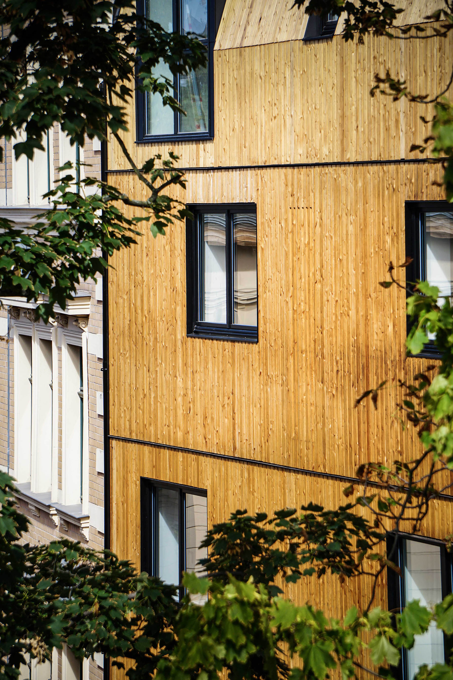 architektur // zwischen moritzburg, saale und dem botanischen garten befindet sich dieser mehrfamilien-neubau. in einer kleinen stichstrasse, im grünen gelegen, ist auf dem bislang als garagenstellplatz genutzten grundstück ein sieben-geschossiger baukörper entstanden, der über eine parkebene und sechs wohngeschosse verfügt. ziel des entwurfes war die prägung eines identitätsvollen, sich in die natürliche umgebung einfügenden wohnortes, welcher sich durch sein reduziert-markantes äusseres von der faden nachbarbebauung abhebt und in die exponierte lage gegenüber der moritzburg eingliedert. die sechs wohneinheiten zwischen 70 und 110 quadratmeter sind etagenweise konzipiert und richtung süden ausgerichtet. die fassadenbekleidung besteht aus vertikalen holzlamellen auf einem untergeordneten schlichten sockel. überdeckte fenster und balkonbereiche stärken den architekturentwurf und ermöglichen ein hohes mass an offenheit und transparenz. fenster in verschiedenen grössen, mit zum teil aus der fassadenebene herausragenden umrahmungen, bilden das pendant zur ruhigen und gleichmässigen holzverkleidung. ingesamt entsteht so ein spannendes fassadenbild mit einer natürlichen hülle und einem einzigartigen burgblick.