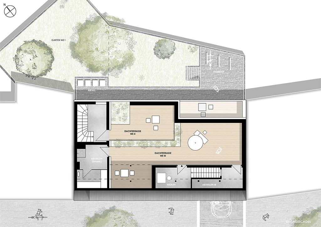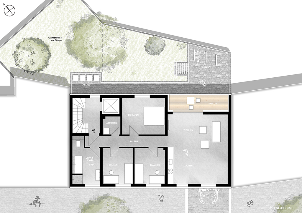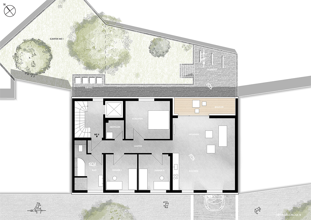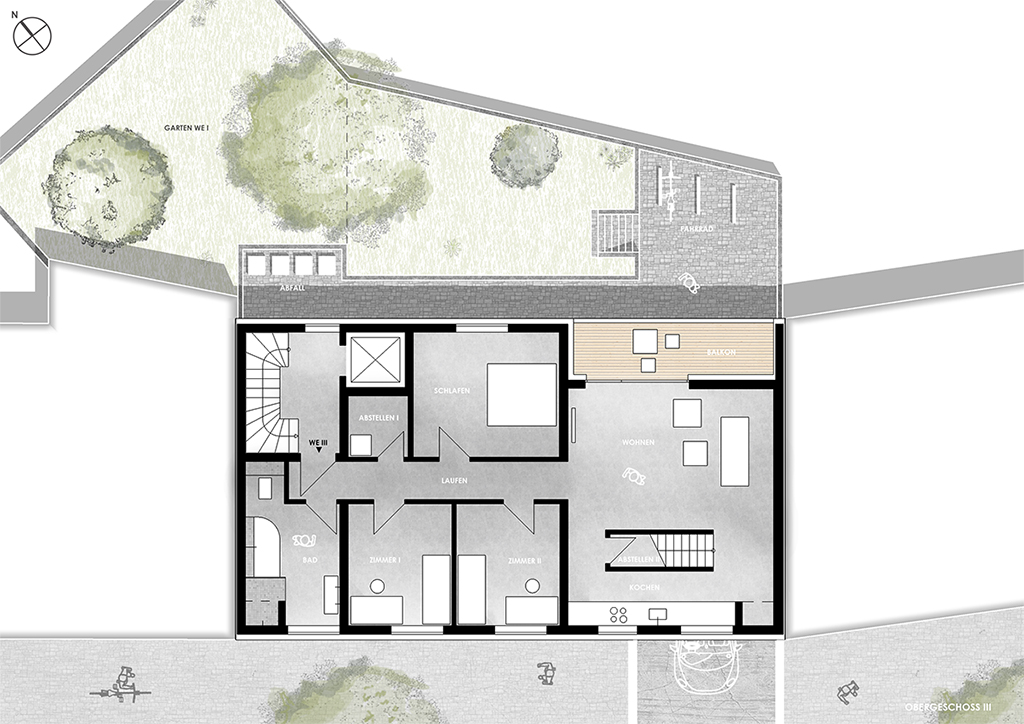 architektur // in kröllwitz, nahe der burg giebichenstein, wird der neubau von 3 wohneinheiten geplant. das gebäude schließt die lücke zweier monotoner nachbarbauten. der architektonische entwurf kennzeichnet sich durch ein pultartiges dach, welches durch die straßenseitige flächenebene durchbrochen wird und einen gaubenartigen vorsprung erzeugt. die fenster der geschosse werden über bänder zusammengefasst und bilden einen rechteckigen block, welcher durch eine schlichte putzfassade gleichmäßig umschlossen wird. der sockel ist farblich abgesetzt und ordnet sich der ansichtsfassade unter. dies schafft eine dezente einordnung in den städtebaulichen kontext. die wohnungen sind etagenweise konstruiert und verfügen über einen vier-zimmer-schnitt. ein durchgesteckter wohn- und kochbereich generiert viel licht und atmosphäre.